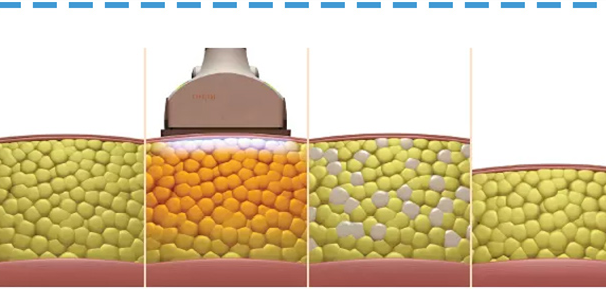 Die laser verhoog die temperatuur van vetselle tussen 42 ℃ en 47 ℃, wat hul struktuurintegriteit beskadig.