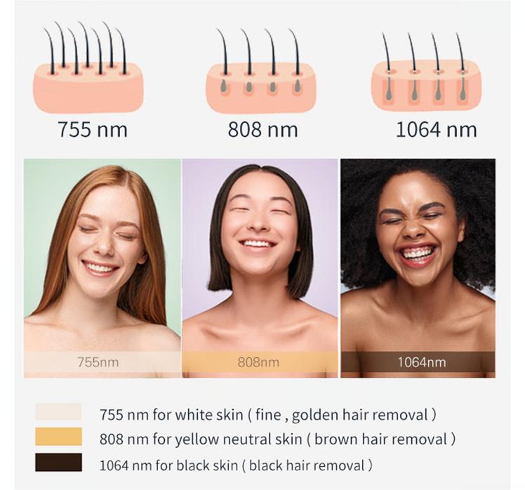 तपाईं 808nm को एकल तरंगदैर्ध्य छनोट गर्न सक्नुहुन्छ, वा तपाईं 755+808+1064nm मिश्रित-तरंग लम्बाइको लेजर छनौट गर्न सक्नुहुन्छ, प्रभावकारी रूपमा सबै रंगको कपालका ग्राहकहरूका लागि उपयुक्त।