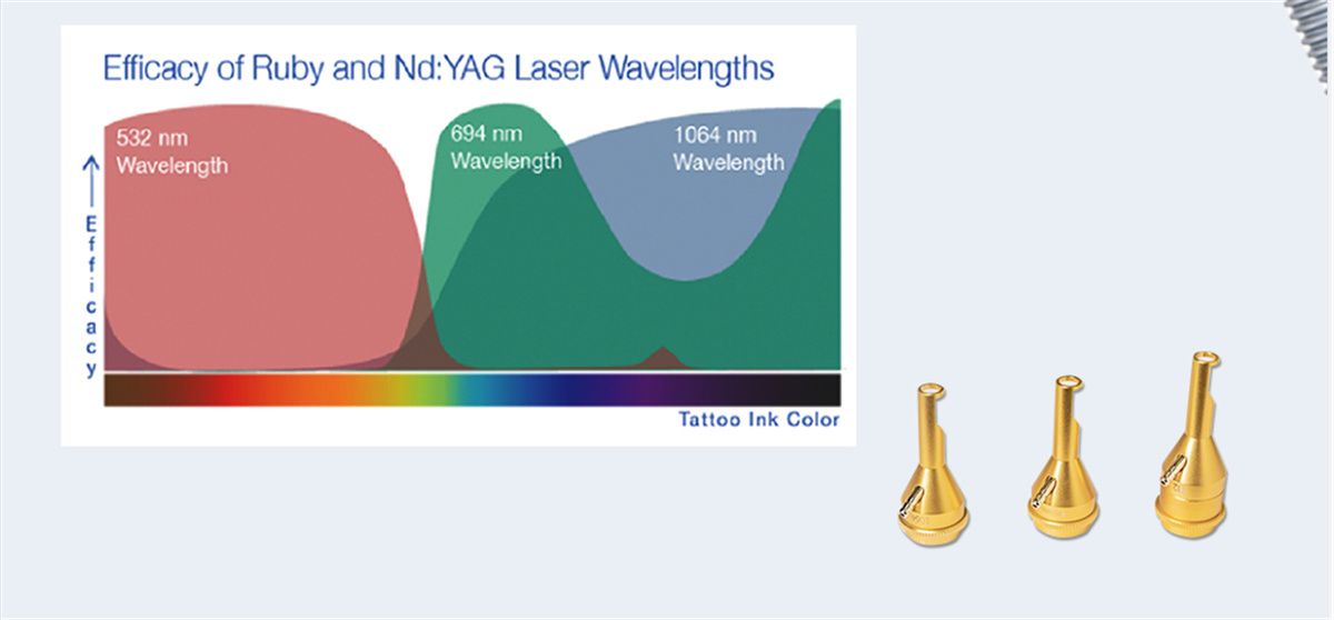 Det finns olika typer av Q-switched lasrar som används för att ta bort tatueringar, beroende på färgen på sjin och tatueringspigmentet. Flerfärgade tatueringar kräver två eller flera typer av lasrar för att effektivt ta bort dem. Lasrarna identifieras vanligtvis av mediet används för att skapa våglängden, som bestäms genom att mäta dess nanometer.
